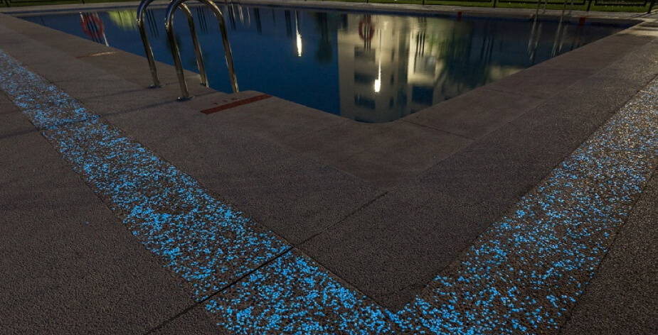A través de un innovador material fotofosforescente, se conjuga el diseño elegante, un ahorro energético, al no necesitar electricidad para la recarga de las luces, y la accesibilidad cognitiva, facilitando la comprensión del entorno al rodear la piscina con luz, indicando el perímetro de seguridad de la misma. Con este sistema se consigue evitar gastos comunitarios buscando siempre la sostenibilidad del medio ambiente y la eficiencia energética.